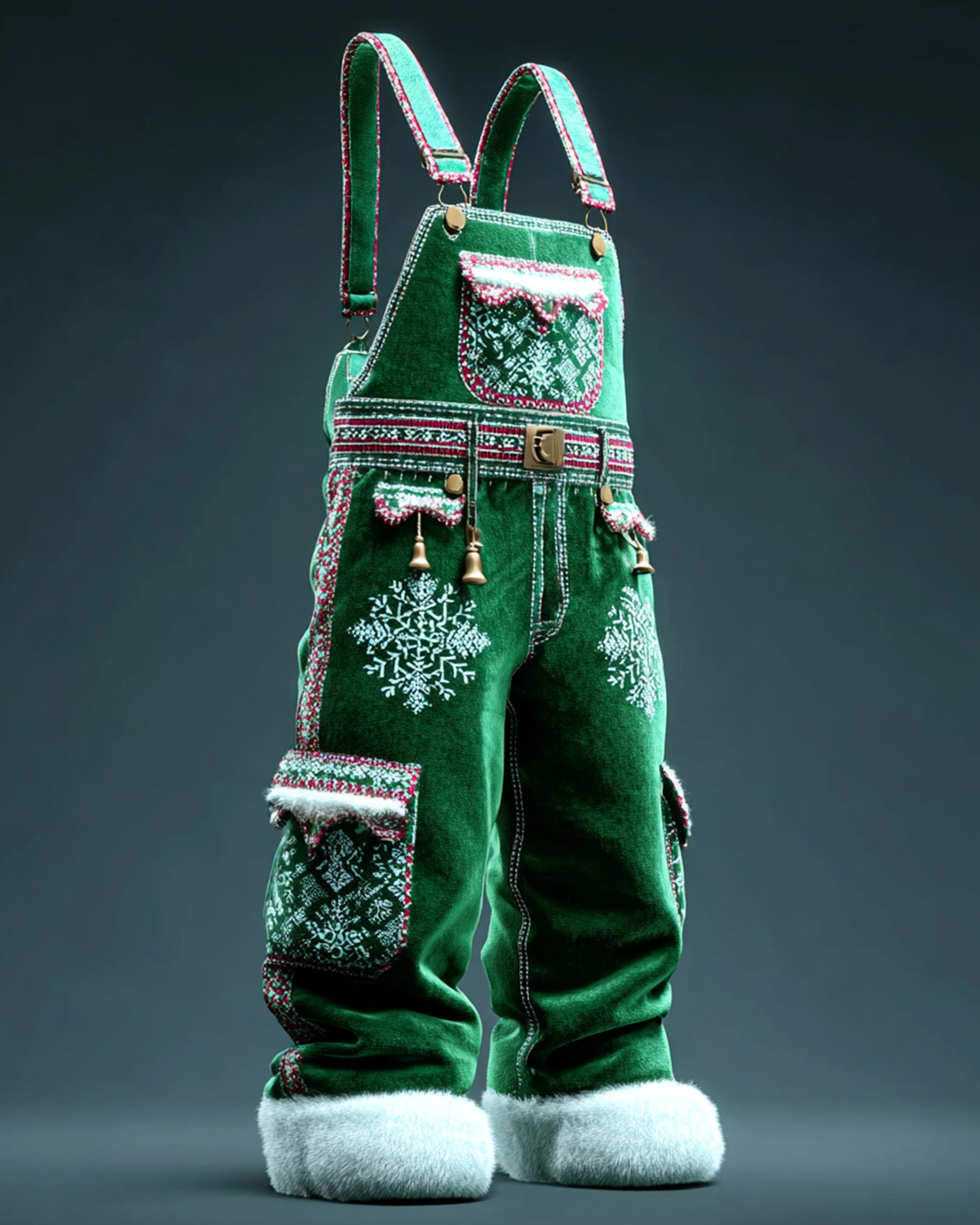 Men's Christmas-Themed Contrast-Color Snowflake Embroidered Velvet Overalls 6038