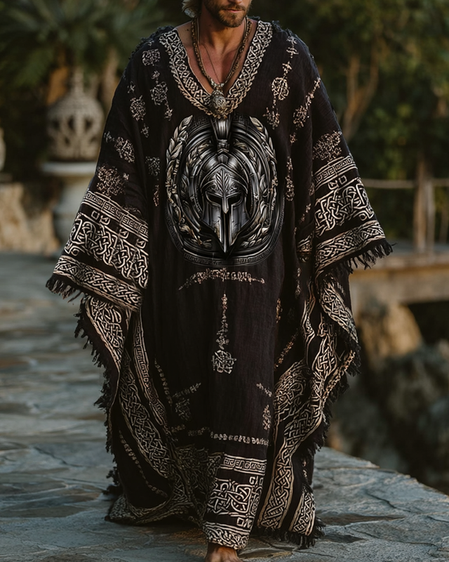 Men's Holiday Viking Theme Spartan Helmet Embroidered Casual Linen Hooded Kaftan 4494