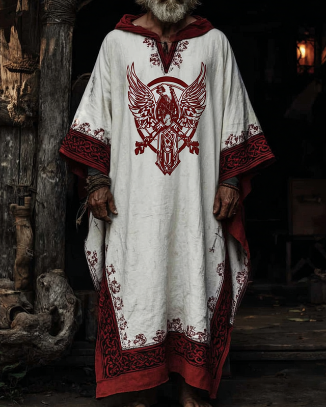 Men's Holiday Viking Theme Wings Embroidery Casual Linen Hooded Kaftan 7818