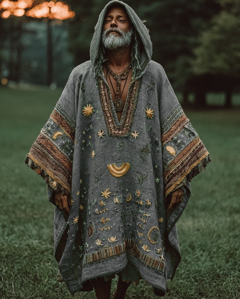 Men's Vacation Stars and Moon 3D Embroidery Casual Linen Stitching hooded kaftan 78b4