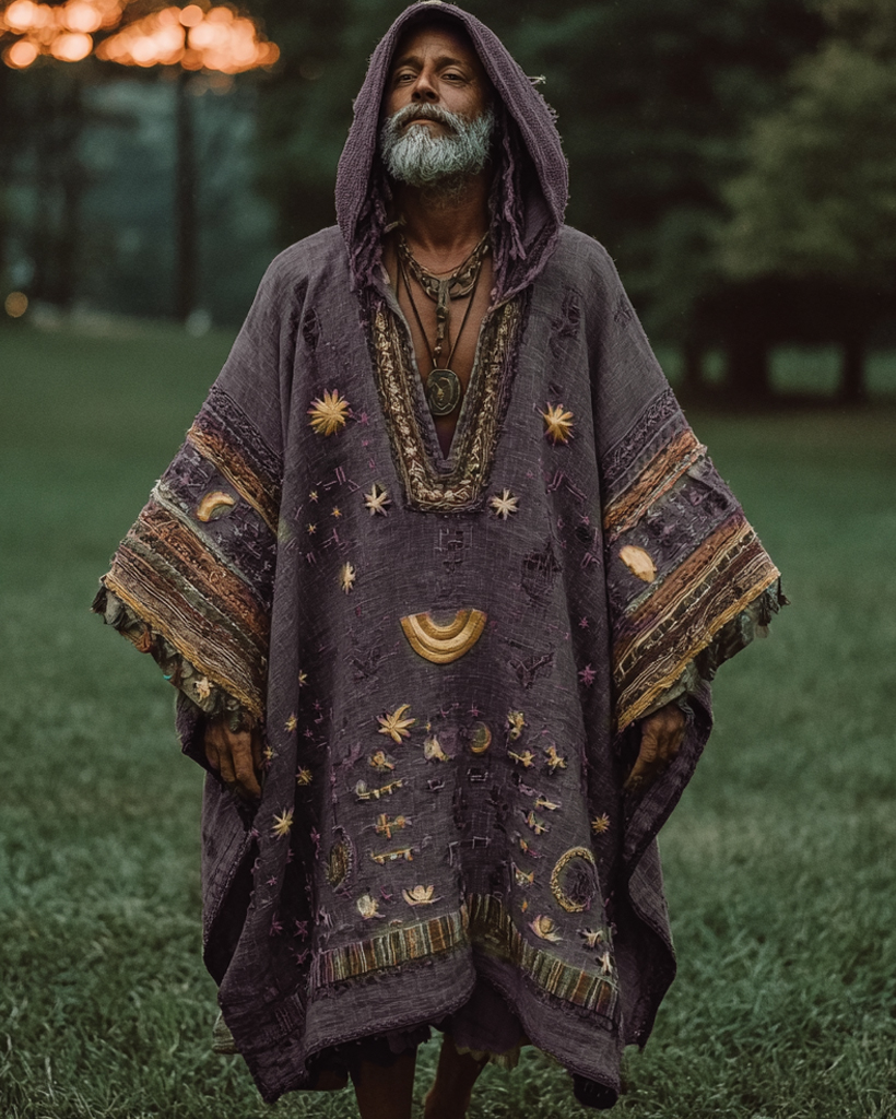 Men's Vacation Stars and Moon 3D Embroidery Casual Linen Stitching hooded kaftan 78b4
