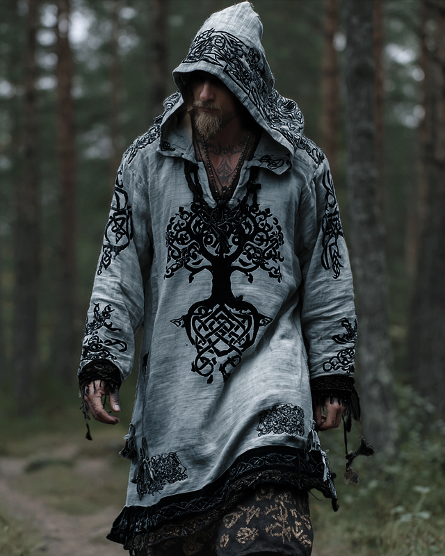 Men's Holiday Viking Themed Tree of Life Stereo Embroidery Casual Linen Hooded Kaftan b0ed