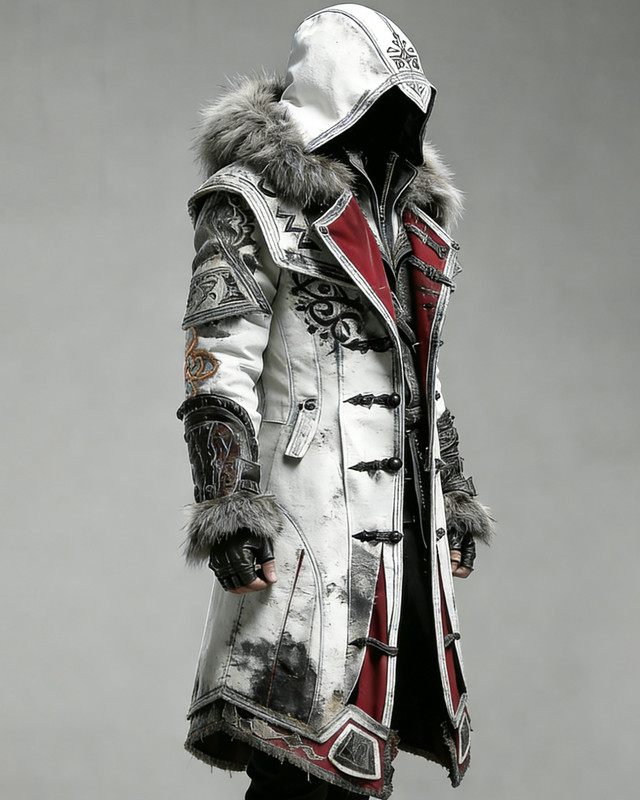 Men's Winter Retro Fashion Assassin and Viking Theme Tree of Life Embroidered Faux Fur Coat 3664