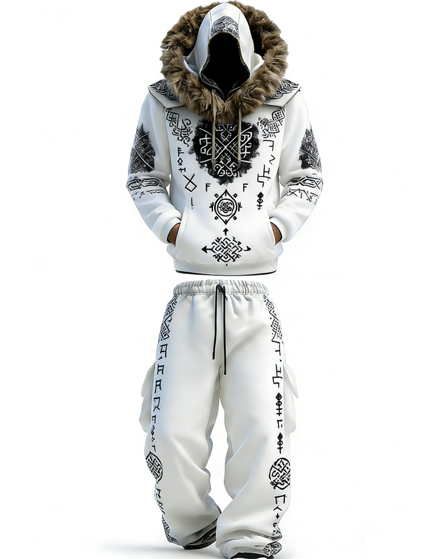 Men's Winter Viking-Themed Warm Leather Hooded Sweatshirt and Pants Two-Piece Set 8476