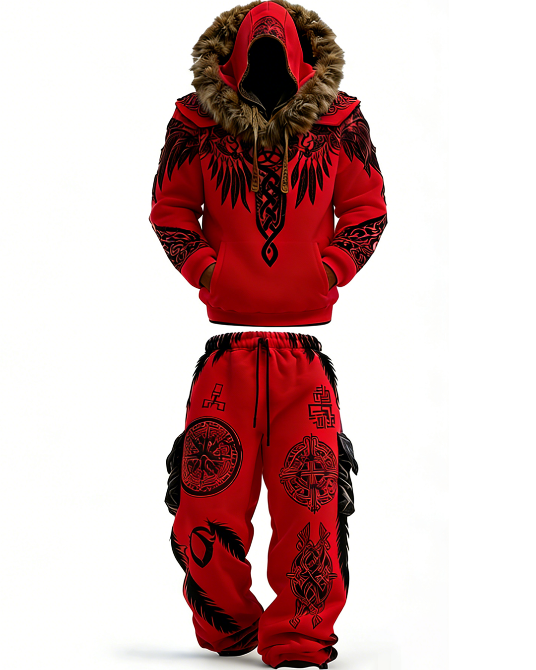 Men's Winter Warmth Red Faux Fur Hoodie and Pants Two-Piece Set 5573