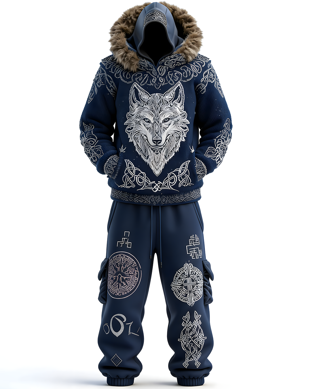 Men's Winter Warmth Wolf Faux Fur Hoodie and Pants Two-Piece Set 6147