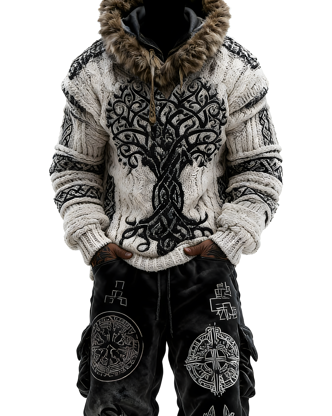 Men's Winter Warmth Color-Block Faux Fur Hoodie and Pants Two-Piece Set 8080